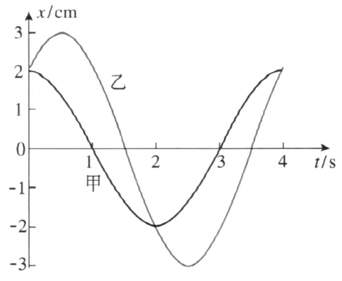4.有甲、乙两个简谐运动:甲的振幅为2 cm,乙的振幅为 3 cm,它们的周期都是 4 s,当 t = 0 时甲的位移为 2 cm,乙的相位比甲落后\(\frac{\pi }{4}\)。请在同一坐标系中画出这两个简谐运动的位移—时间图像。