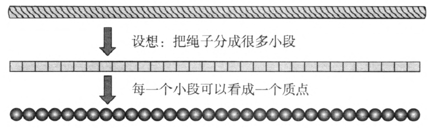 在回答以上问题的基础上,教师带领学生进一步分析和推理绳波形成的详细过程。建立理想模型是物理学中对客观事物进行研究的一种科学方法。设想把绳子分成很多小段,这些小段可以看作一个个相连的质点,这些质点间存在着弹性力的作用,具体如图 3–1 所示。