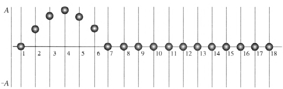 然后播放模拟动画,其中第一个质点受到外力作用将开始在垂直方向上做简谐运动。若在 t = \(\dfrac{1}{4}\)T 时第一个质点运动到最高点(图 3–2),请问第几个质点即将开始运动?