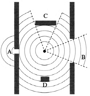 提示:A 孔与 D 障碍物尺寸比较小,波传播时容易绕到背后“阴影”区,B 孔与 C 障碍物尺寸较大,不容易发生明显的衍射现象,波传播时几乎沿直线传播。