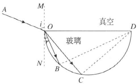 由折射定律得 nsin r = sin i,解得 t = \(\dfrac{{2R\sin i}}{c}\)。由题知,入射角 i 相同,R、c 为常量,所以时间 t 相同。