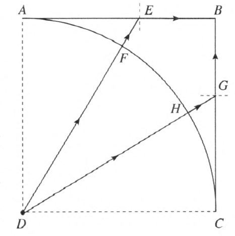 5.如图 4–7,图中阴影部分 ABC 为一透明材料做成的柱形光学元件的横截面,该种材料折射率 n = 2,\(\overset{\frown}{AC}\) 为一半径为 \(\dfrac{1}{4}\)R 的 圆弧,D 为圆弧面圆心,ABCD 构成正方形,在 D 处有一点光源。若只考虑首次从圆弧 \(\overset{\frown}{AC}\)直接射向 AB、BC 的光线,从点光源射入圆弧 \(\overset{\frown}{AC}\) 的光中,有一部分不能从 AB、BC 面直接射出,求这部分光照射圆弧 \(\overset{\frown}{AC}\) 的弧长。