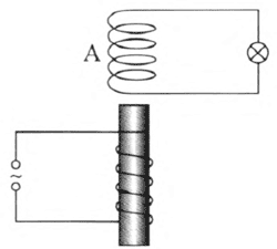 演示:实验装置如图 2–3 所示。当穿过螺线管的磁场随时间变化时,在空间激发的感生电场使线圈 A 中产生感应电动势,感应电流使灯泡发光。