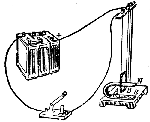 如图 10–1 所示,将矩形线圈悬挂在支架上,线圈的 AB 边悬在蹄形磁铁的两极间。按照图 10–1 把电路连接好。