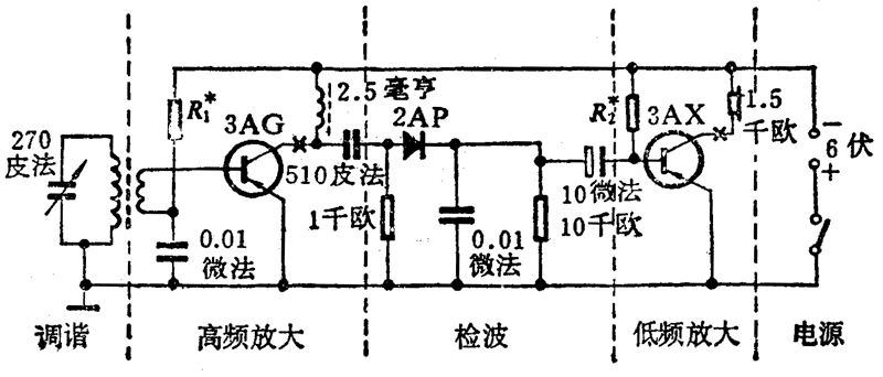 图 10–6 是一个两管收音机的线路图,它包括调谐、高频放大、检波、低频放大四个部分,图中已经用虚线隔开,图中的 R1*和 R2*叫做偏流电阻。