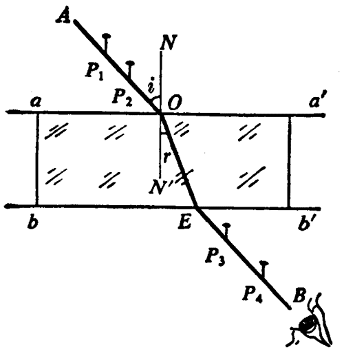 记下 P3、P4 的位置。移去玻璃砖和大头针,过 P3、P4 引直线 EB,与 bb′ 交于 E,EB 就表示沿 AO 方向入射的光线通过玻璃砖后传播的方向。连接 OE,OE 就是玻璃砖内折射光线的方向,入射角 i = ∠AON,折射角 r = ∠EON′。