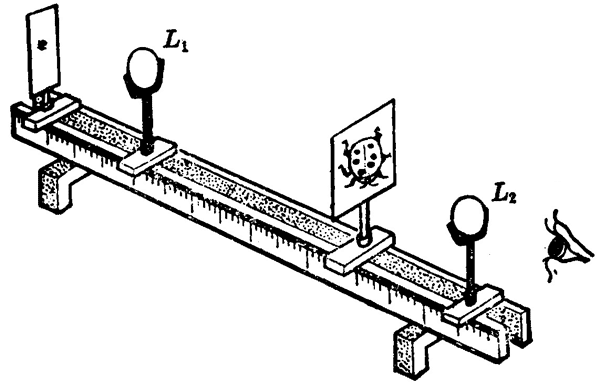 实验装置如图 10–8 所示。把一块玻璃竖立在光具座的一端,玻璃上粘一个小物体(例如一个小昆虫等)。用焦距 f1 较短的凸透镜 L1 做物镜,焦距 f2 较长的凸透镜 L2 做目镜,把它们安装在光具座上,在 L1 和 L2 之间放一个光屏,调整 L1、L2 的高度,使它们共轴。同时调整玻璃和光屏的高度,使玻璃上的小物体和光屏的中心在 L1 和 L2 的主轴上。
