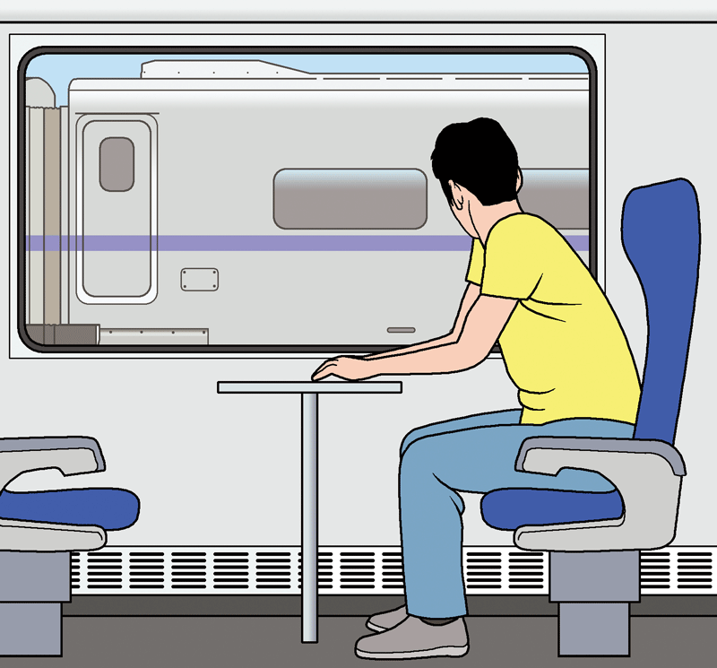A、B 两列列车并排停在站台旁,图 2–1–2 中 A 车上的乘客望向窗外。过了一会儿,乘客觉得自己乘坐的列车动了。当 A 车“驶过”并排的 B 车车尾后,乘客才发现窗外仍然是静止的站台和轨道,自己其实没动过。