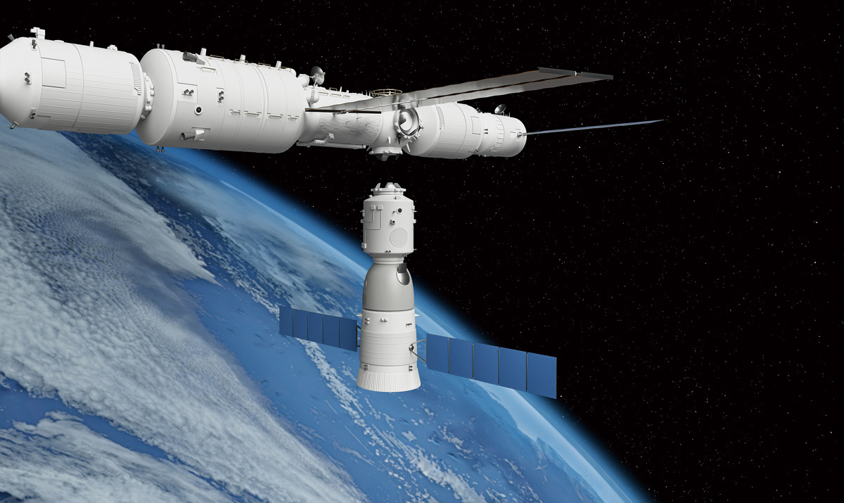 图 2–1–3 是神舟飞船与空间站对接时的示意图。在此过程中,飞船和空间站相对地球运动的速度很大,实现对接有很大的难度。飞船靠近空间站时,相对于空间站是运动的。完成对接后,飞船和空间站同步运动,飞船相对于空间站是静止的。