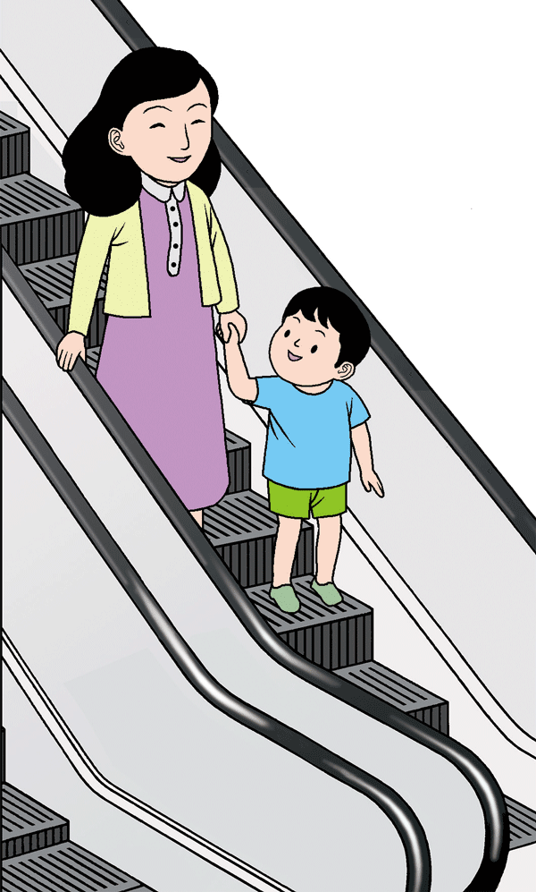 3.妈妈和小东正乘自动扶梯下行(图 2–1–4)。小东突然想要跑下去,妈妈说:“这样很危险,乘自动扶梯时你要牵着妈妈的手,站着不动。”