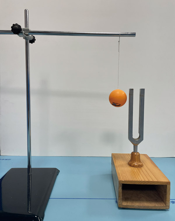 2.如图 3–1–12 所示,敲击音叉后,将音叉靠近悬挂着的乒乓球。简述观察到的现象,并对此进行解释。