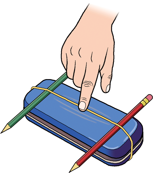 如图 3–1–2 所示,拨动紧绷在笔盒上的皮筋,皮筋振动,就能听到皮筋发出的声音。将手指放在正在播放音乐的扬声器上,手指会感到扬声器在振动。