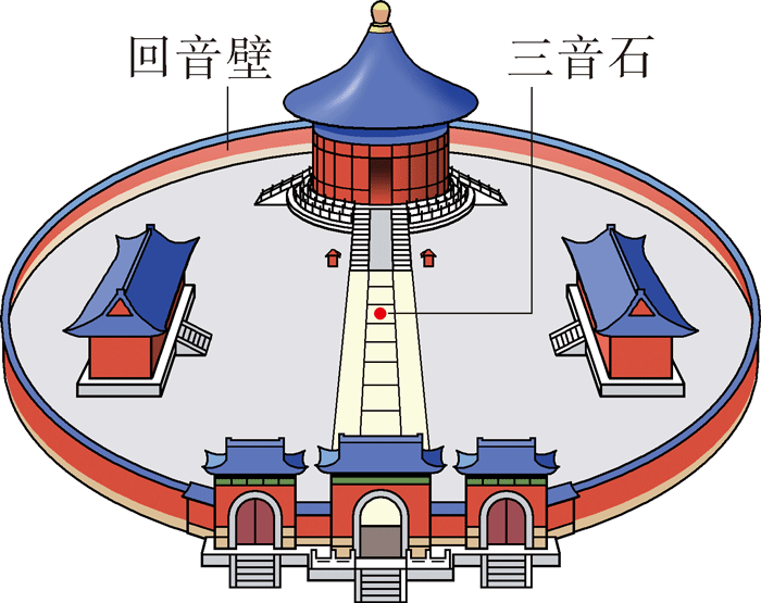 声音在介质中传播,遇到障碍物时,一部分被反射回来,形成回声。如果传到人耳的前后两次声音的间隔超过 0.1 s,人耳就能将回声和原声区分开。在山谷里喊一声,可以听到回声。如图 3–1–8 所示,北京天坛公园回音壁的圆心处有一块三音石,站在它上面拍一下手后,可以听到多次较明显的回声。