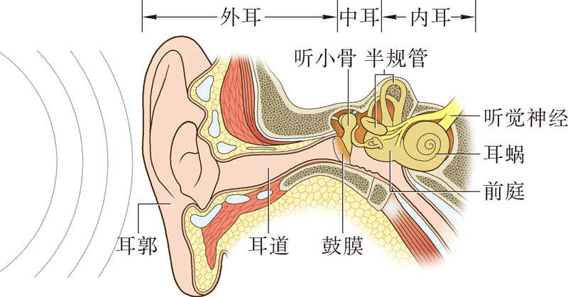 图 3–1–9 是人耳的结构示意图。耳郭相当于一个声波收集器,声波传入耳道中,引起鼓膜振动,鼓膜的振动通过听小骨传至耳蜗,然后通过听觉神经将信息传到大脑,产生听觉。