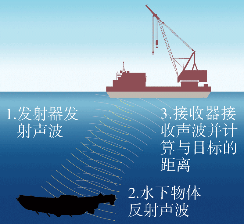 声波能传递信息,如列车员通过列车鸣笛声的长短可判断列车运行的情况。人们根据声波在水中能远距离传播的特点,制成声呐装置。如图 3–3–2 所示,利用声呐装置能对水下物体进行定位。在探测“长江口二号”古船位置的过程中,