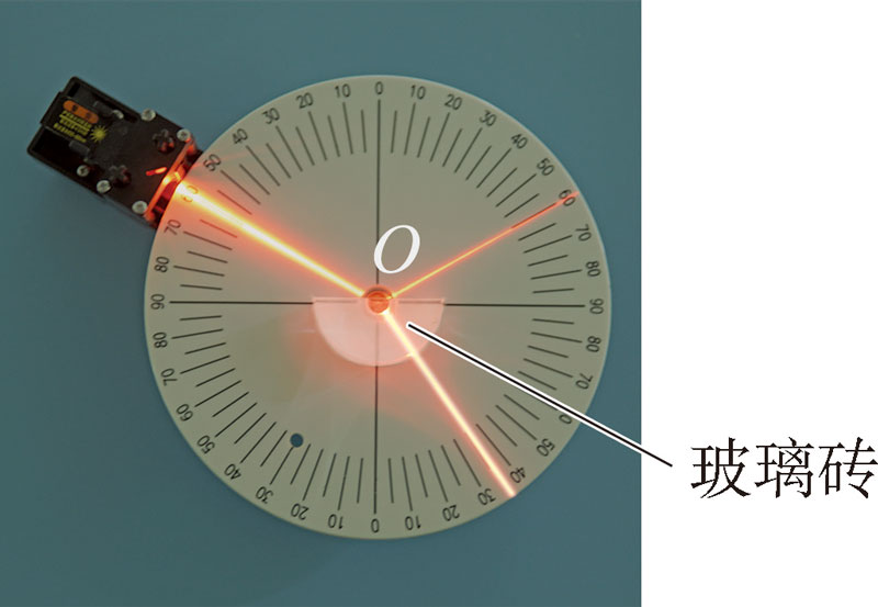如图 4–3–4 所示,在光具盘中央放一块半圆形玻璃砖。一束激光从空气斜射向半圆形玻璃砖的中心 O。观察玻璃砖中的折射光线,比较折射角与入射角的大小关系。改变入射角的大小,观察折射角的变化情况。