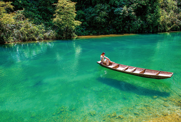 炎炎夏日,清澈见底的山中潭水(图 4–3–5),让人有下水嬉戏的欲望,但千万不要觉得水看起来不深就贸然下水,在潭边上看水的深度总比实际的要浅一些,这是因为光发生了折射。如图 4–3–6 所示,在容器底部有一个石块,它从水下发出的光线 AO 和 AOʹ 在斜射向空气时发生折射,折射光线 OB 和 OʹC 进入人眼时,由于人感觉光是沿着直线传播的,会认为光线是从 OB 与 OʹC 反向延长线的交点 Aʹ 射出的。人看到的石块的像在石块实际位置的上方。图 4–3–1 中的筷子看上去折成两段也是同样的道理所致。