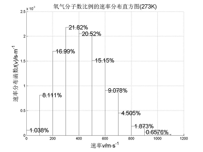 (1)如图 1 所示,取速率间隔为 100 m/s,速率分布函数由直方条组成,其顶部呈阶梯形折线。速率在 0 ~ 100 m/s 之内的分子数占总分子数的比例约为 1.04%,速率在 100 m/s ~ 200 m/s 之内的分子数占总分子数的比例约为 8.11%,……,速率在 300 m/s~400 m/s 之内的分子数占总分子数比例最高,大约为 21.8%,……,速率在 900 m/s ~ 1000 m/s 之内的分子数占总分子数比例只有 0.658%。由于速率间隔比较大,分子数比例的误差也比较大。