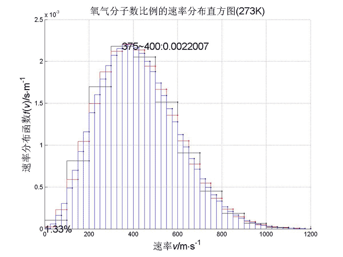 绘制直方图矩形的思路是:若绘制的是 0 ~ 100 m/s 速率区间,则根据分布函数求出中值 50 m/s 对应的值,然后乘以 Δv = 100,这个数值就是 0 ~ 100 m/s 速率区间分子数占总分子数的比例,实际求的是矩形的面积。但这样做误差较大,在 0℃ 时,可求出速率在 0 ~ 100 m/s 之内的氧气分子数占总分子数的比例约为 1.04%,但教科书上的真实值约为 1.4%。从图中直方图面积(计算值)和曲线面积(真实值)就可看出,中间部分的误差相对较小,在 0 ~ 100 m/s 范围内误差是最大的。