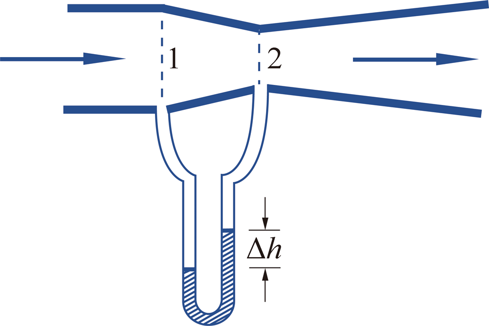 流体压强和流速的关系应用十分广泛。文丘里流量计是一种测量有压管道流量的装置,常用于测量空气、天然气、水等流体的流量。图 6–6–4 所示是文丘里流量计的结构示意图,流体在通过流量计时局部收缩,从而使流速增大,压强减小,因此流体在截面1和截面2处有压强差,通过测量压强差来测量流量大小。