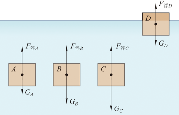决定物体在液体或气体中浮沉的条件是物体受到的重力与浮力之间的大小关系(图 7–3–2)。