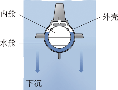 潜水艇的浮潜原理与浮沉子类似。图 7–3–4 是潜水艇的横截面示意图,潜水艇的内舱与外壳之间有一个水舱,水舱通过阀门与外界相连。阀门打开,海水进入水舱,潜水艇所受重力增大,当重力大小大于浮力大