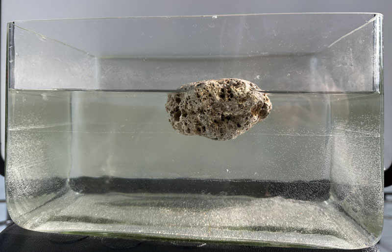 7.石头入水即沉是我们日常生活中常见的现象,但火山喷发产生的浮石可以漂浮在水面(图 3)。火山喷发后,大量炽热的岩浆涌入冰冷的海水,遇冷形成岩石,称为浮石。由于岩浆瞬间凝固形成岩石,岩浆中的气体形成气泡被锁在内部,形成大量孔洞,孔洞占总体积的一半以上。大量浮石聚在一起有时会形成一座浮岛,被称为“浮石筏”。解释浮石可以漂浮水面的原因。