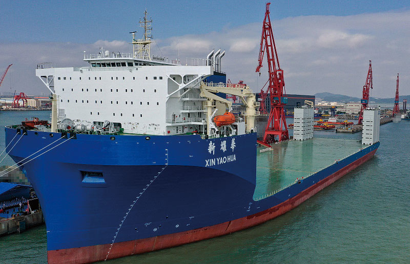 8.半潜船是一种特种运输船舶,有较大的载货甲板,船头或船尾有较高上层建筑或甲板室或浮箱。半潜船工作时除船楼建筑以外的船身(包括甲板)潜入水下,来装运如石油钻井平台、大型舰船、潜艇甚至航母等超长超重但又无法分割吊运的大型设备。