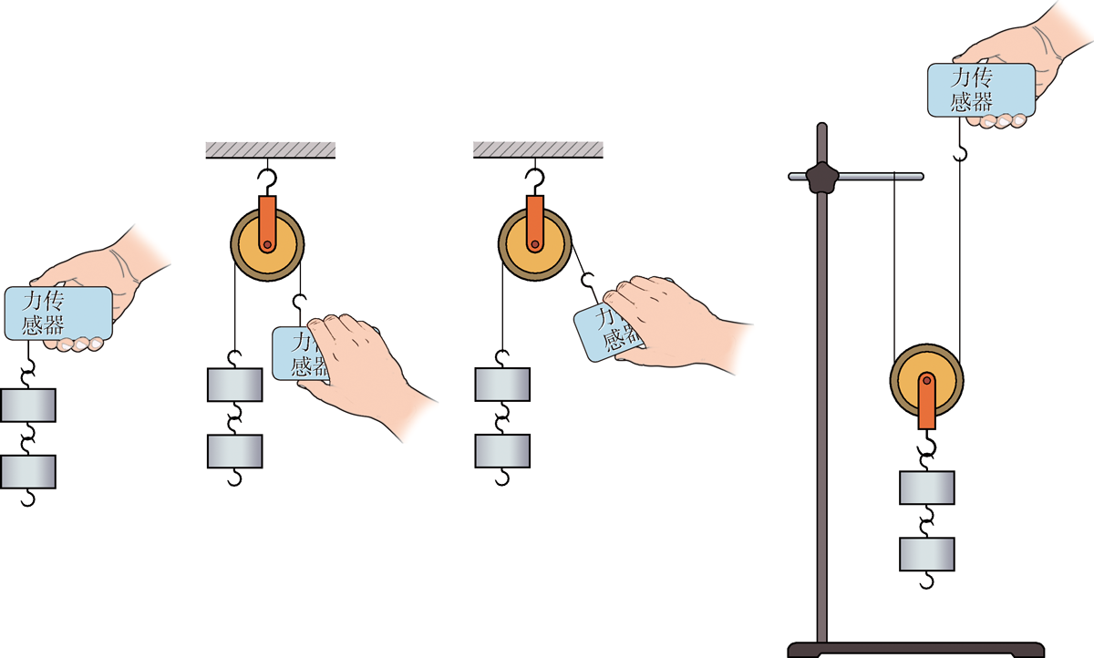 如图 8–2–4 所示,用不同的方式匀速提起两个质量均为50 g的钩码,观察力传感器的用力的方向,记录传感器的示数及使用滑轮时钩码和绳子提拉端移动的距离,归纳定滑轮和动滑轮的使用特点。