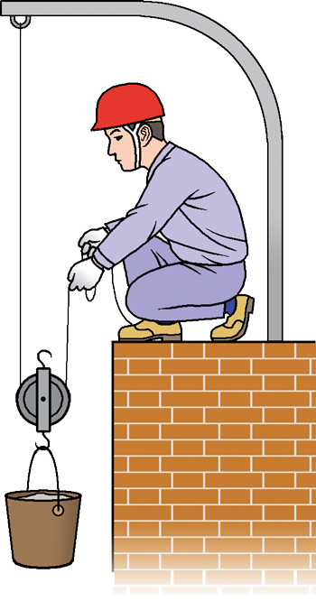 滑轮在日常生活中有着广泛的应用。升国旗时,人只需站在地面不断向下拉绳子,国旗就能随着另一侧的绳子上升,这是利用旗杆顶部的定滑轮可改变用力方向实现的。建筑工人利用动滑轮可以较省力地将建筑材料提升至高处(图 8–2–7)。