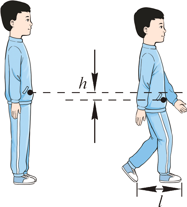 全民健身是全体人民增强体魄、健康生活的重要措施,是每个人健康成长和幸福生活的重要基础。健步走可以起到锻炼身体的目的。人走路时,重心会发生上下移动。某人的质量为 50 kg,腿长 65 cm,重心大约位于肚脐上方 7 cm 处。此人按步距 l = 50 cm 走路,每走一步,重心位置高度变化 h = 5 cm,如图 8 所示。