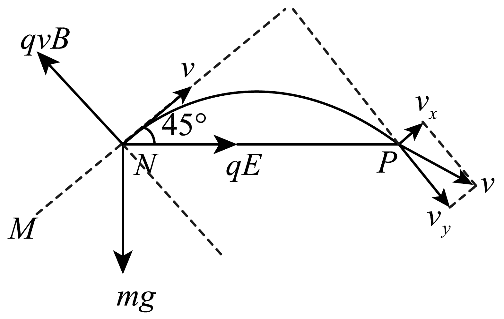 如图,真空中存在一水平向右的匀强电场,同时存在一水平且垂直纸面向里的匀强磁场。一质量为 m、电量为 q(q > 0)的带电微粒从 M 点以初速度 v 入射,沿着 MN 做匀速直线运动。微粒到 N 点时撤去磁场,一段时间后微粒运动到 P 点。已知 M、N、P 三点处于同一竖直平面内,MN 与水平方向呈 45°,N 点与 P 等高,重力加速度为 g,则( )