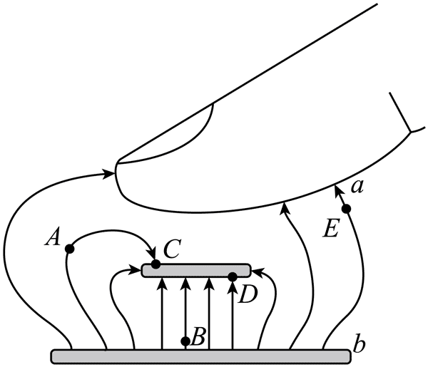 手机电容式触摸屏的核心部件可简化为平行板电容器。当手指靠近触摸屏时,电容器两极板和手指间的电场线分布如图所示。下列说法正确的是( )