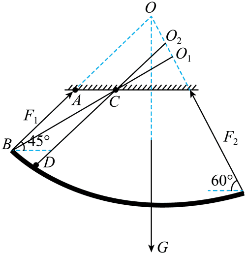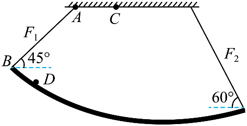 如图所示,一盏重为 G 的艺术灯用细绳悬挂,左右两侧细绳与水平方向夹角分别为 45° 和 60°,细绳拉力分别为 F1 和 F2。A 和 B 是左侧细绳两端点,C 和 D 分别是天花板和灯上的点,CD 与 AB 平行,则( )