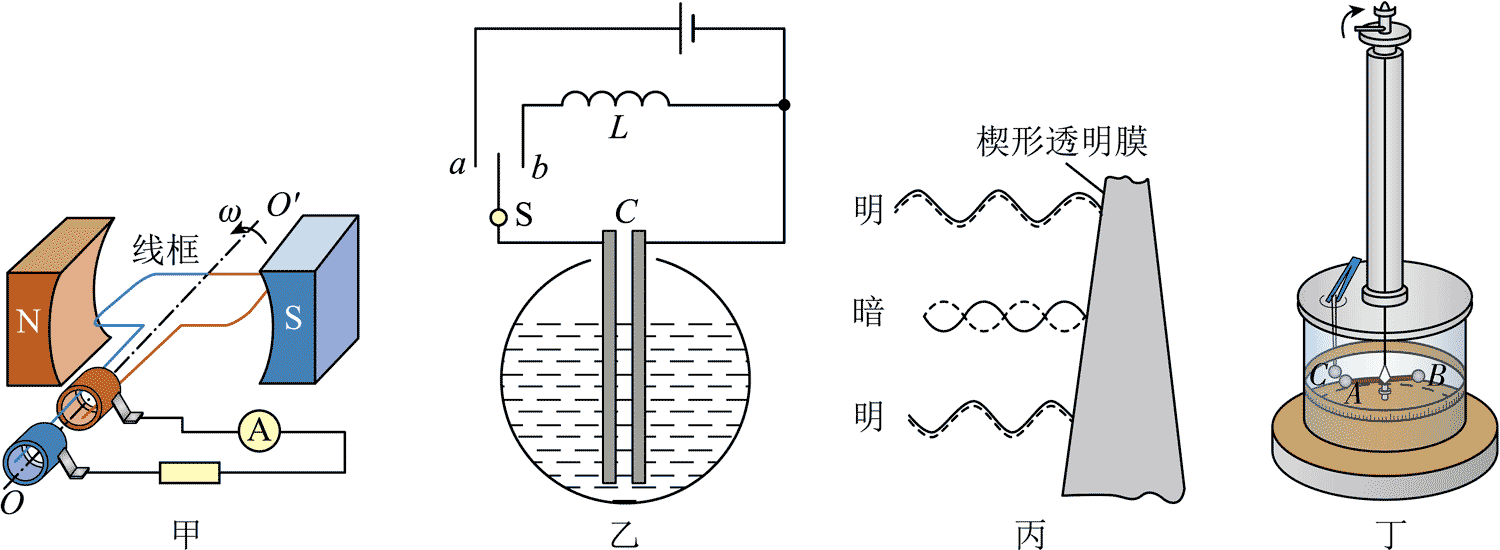 D.用图丁中扭秤探究电荷间相互作用力时,应使金属小球 A 与 C 带同种电荷,两球由于排斥而使 A 转动,D 正确。