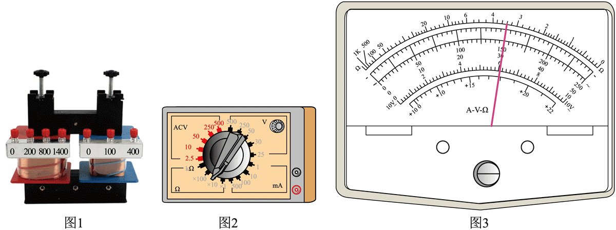 (1)小明先用多用电表测量图 1 变压器的“0”、“1 400”接线柱间的电阻。选择开关位置如图 2,经规范操作,指针位置如图 3,测得阻值为________Ω。