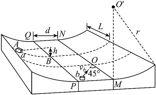 如图所示。一宽度为 d 的光滑长方形平板 MNOP,长边 MN、PQ 分别平滑连接半径均为 r 的光滑圆弧面,形成“U”形槽,将其整体固定在水平地面上。现有质量为 m 的物块 a,从圆弧面上相对平板竖直高度为 h 的 A 点静止下滑(h ≪ r),途经圆弧面上最低点 B,平板上有一质量为 \(\frac{m}{3}\) 的物块 b 与 MN 成 45° 角从 O 点滑入圆弧面,第一次到达最高点时恰好与同时到达最高点的物块 a 发生弹性碰撞。两物块均为质点。