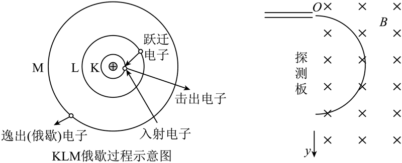 (3)甲同学利用带电粒子在磁场中的运动规律,设计了如图 2 所示的测量俄歇电子动能的方案;俄歇电子从原点 O 垂直 y 轴和磁场方向进入匀强磁场,则 y1 = 10.0 cm 和 y2 = 10.5 cm 处被探测到,通过测得的俄歇电子的动能,求原子 M 层的电离能 EM;