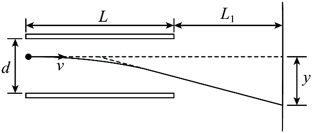 需要测量的物理量:金属板长度 L,板间电压 U,板间距 d 以及 L1,电子飞出电场后打到荧光屏时垂直电子入射方向的侧移量 y;