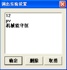 工具栏图标为 ,调用已保存的实验设置。点击该图标后,弹出如图67所示窗口,从中选取拟做的实验条目。如果调用的实验与现在接入的传感器种类或传感器通道不一致,会弹出“请将**传感器接入**通道”提示窗口。正确接入传感器后,可顺利调出实验设置。在本窗口中也可选中某一实验条目进行删除。