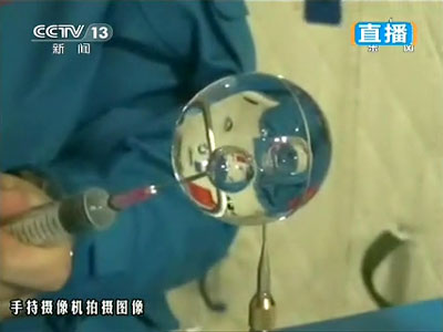 王亚平用金属圈重新做了一个水膜,然后用饮水袋慢慢地向水膜上注水,水膜就变成了一个亮晶晶的大水球。用注射器向水球内注入空气,在水球内产生了两个标准的球形气泡,气泡既没有被挤出水球,也没有融合到一起。水球也没有爆裂。这些现象充分表明了流体表面张力的巨大作用,在微重力环境,它已经成为控制流体运动行为的主导因素。