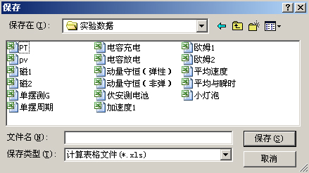 点击“保存”,界面将弹出如图103所示的窗口,供用户选择保存数据的路径和定义文件名称。选择完毕,点击窗口中的“保存”按钮,将对当前表格中所有数据(包括实验数据、变量、表达式及计算结果)以文件的形式进行存储,文件格式为(*.xls)。