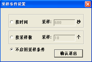 使用自动记录功能时,可以通过预设采样条件来控制自动结束记录数据,点击“采样条件”按钮,弹出“采样条件设置”窗口(图89),从窗口中可设置为“按时间”可“按采样点”进行采样,设置成功后,点击“开始”将自动记录数据,并且在表格下方蓝色的进度条中观察记录数据的进度,当满足设置条件后停止记录。采样条件设置的内容在软件关闭后将被保留,直到重新设置后才会更新。软件的初始设置为“不启用采样条件”,即通过点击“结束”控制记录停止。
