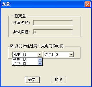 在使用多个光电门传感器时,有时不仅需要测量每个光电门传感器的挡光时间,而且需要测出挡光片在两光电门传感器之间运行的时间。因此图91所示窗口内,特设定了记录“挡光片经过两光电门时间”的功能(灰色部分),当接入光电门传感器后此功能才被激活。可通过下拉条选取挡光片通过任何两只光电门之间的时间,点击“确定”后,记录的时间可作为变量添加在表格中,该变量名称由t+2位数字组成(如t13),t表示时间,2位数字表示选取的两光电门的通道序号。此时无论所采用I型还是U型挡光片,记录的均为挡光片前沿两次挡光的时间间隔。