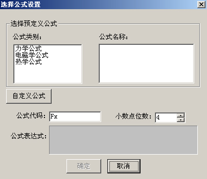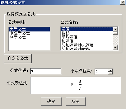 ◆使用公式库设置公式,应首先在窗口中选择公式的类别。软件提供的公式类别有“力学”、“电磁学”、“热学”三大类。选中类别和公式名称后,将显示出公式代码和公式表达式,公式代码以及小数点位数可以手动设置。见图93。