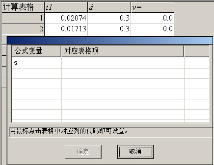 选中公式后,点击“确定”,将弹出如图94所示的窗口。须在该窗口中确立公式变量与表格中的对应项的关联。方法如下:直接点击计算表格中的变量代码,如公式变量s对应表格中的变量d,则直接点击d所在的单元格。