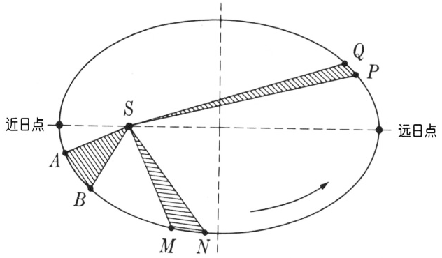 开普勒进一步又发现了面积定律,即开普勒第二定律,内容是:在同样时间里,火星向径(即太阳中心到行星中心的连线)在轨道平面内扫过的面积相等。这就是说,行星离太阳越近,它运动得越快。1609 年,他出版了《新天文学》一书,公布了这两条行星运动定律。开普勒在书中还指出,这两条定律也适用于其他行星绕太阳和月球绕地球的运动。