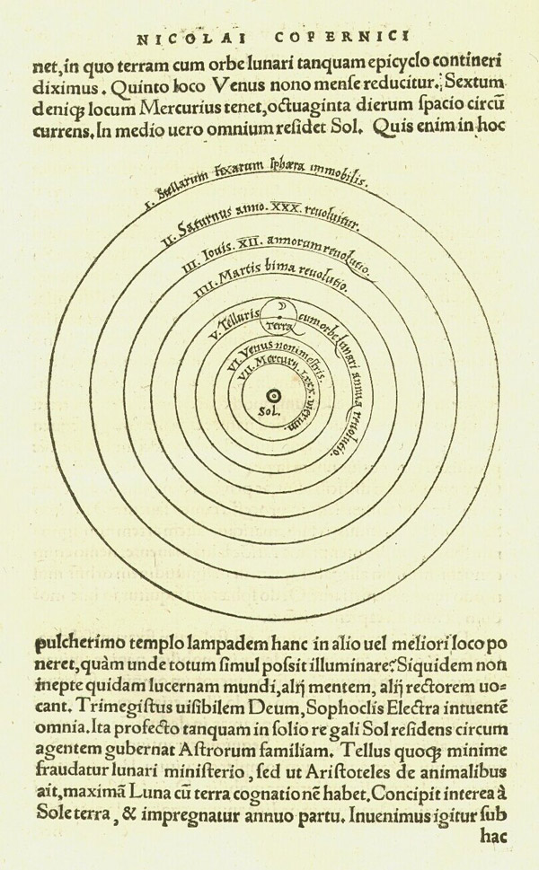 应该说,早在文艺复兴时期就已有许多进步思想家和天文学家对破绽百出的地心体系表示怀疑。但是,真正打破这个体系的第一人是 16 世纪伟大的波兰天文学家哥白尼。他分析了托勒密的地心体系,经过几十年的研究,建立了一个崭新的宇宙体系,这就是日心体系。他认识到地球也是一颗行星,和别的行星一样,都以同心圆围绕太阳运行。行星排列的次序是水星在最小的圆周上,依次往外是金星、地球、火星、木星,最后是土星,土星在最大的圆周上。而月球并不是行星,它围绕地球旋转,同时也被地球带着围绕太阳运行,众恒星则固定在遥远的空间里,并没有绕大地昼夜旋转。星空的旋转是地球自转的视觉效应;而在地球上看到的其他行星的顺行和逆行,则是所有行星绕日公转的结果。