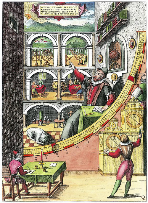 第谷在丹麦国王的资助下,1576 年在哥本哈根海峡的一个小岛上修建了一座完善的天文台。第谷增大了观测仪器的尺寸并安装在坚固的基础上,给仪器进行了精密刻度,从而提高了仪器的精密度、稳定性和长期反复观测读数的可靠性。第谷还对大气的折射效应进行了修正,使他的观测的准确性达到前人的几十倍,甚至上百倍。经过二十余年的观测,第谷测量各个行星角位置的误差仅为 2′。不过,第谷并不相信哥白尼的学说,他认为地动思想是不能接受的,因此他的观测所依据的是一个折中的宇宙体系。在这个体系里,除地球和围绕着它的月亮外,其他天体都绕太阳运转,太阳率领着众行星围绕着地球运转,地球是静止不动的。