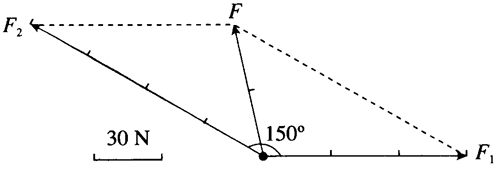 如图 3–15 所示,当两个力的夹角为 150° 时,对角线长 2 cm,则合力的大小 F = \(\frac{{2\;{\rm{cm}}}}{{1\;{\rm{cm}}}}\)×30 N = 60 N,量得 F 与 F1 的夹角为 103.5°。